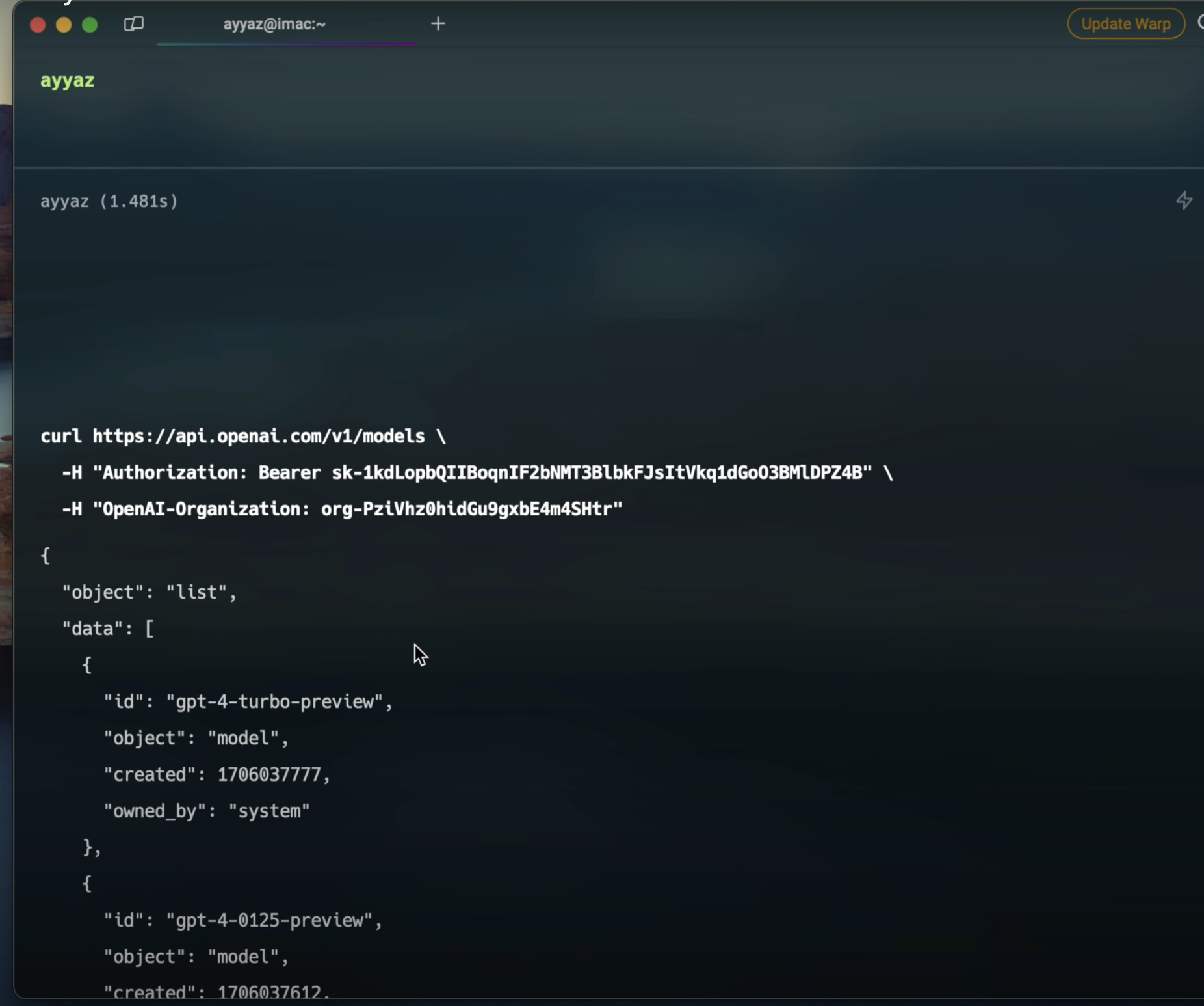 If your API key is valid, the command will return a list of available models.
