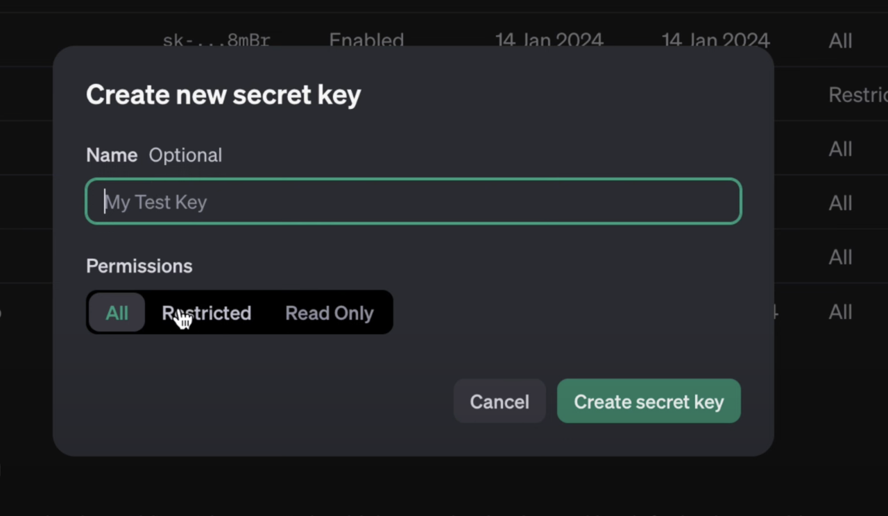 - Click on "Create secret key" to generate the API key.