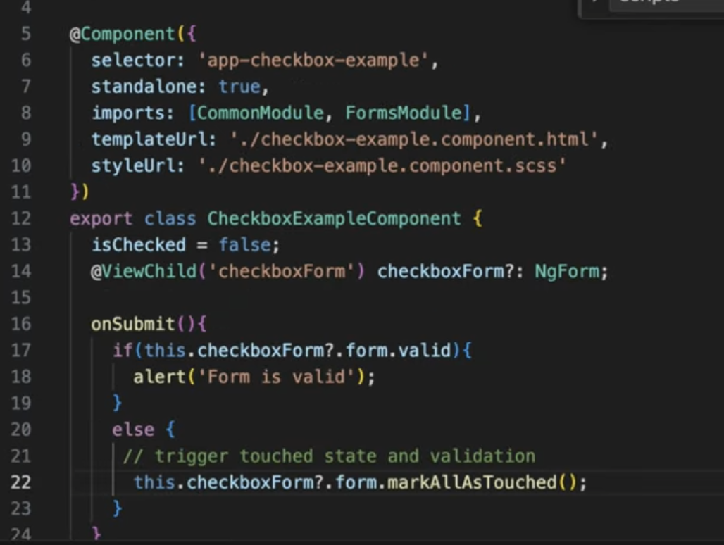 Step 2: Import the Forms Module Open the checkbox-example.component.ts file. Since we're using a standalone component, import the FormsModule directly in the imports array: