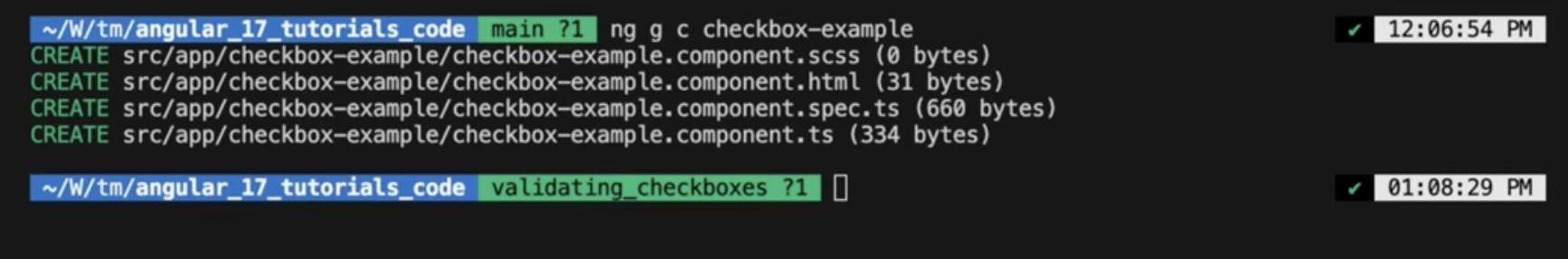 Step 1: Create a New Component First, create a new component called CheckboxExampleComponent to hold the code related to the checkbox example. Use the Angular CLI command ng g c to generate the component folder and files: